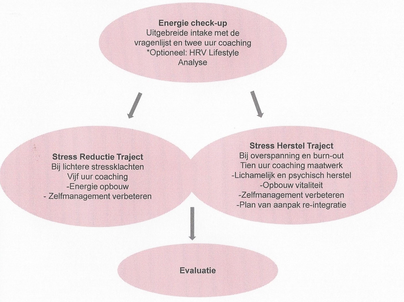 Doorlichting en voorlichting van het energetisch functioneren. We starten beiden trajecten met twee sessies van een uur n.a.v. de uitkomsten van de CSR vragenlijst Stressklachten (De vragenlijst dienst als nulmeting, tussentijdse- en eindmeting. De scores geven een betrouwbaar beeld van de mate van stress, depressie, angst, vermoeidheid en cognitief functioneren.)
